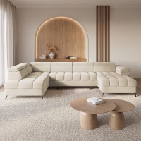 Adepte du design moderne ? Notre canapé panoramique convertible avec coffre de rangement en tissu beige- Angle Droit est la pièce qu’il vous faut !